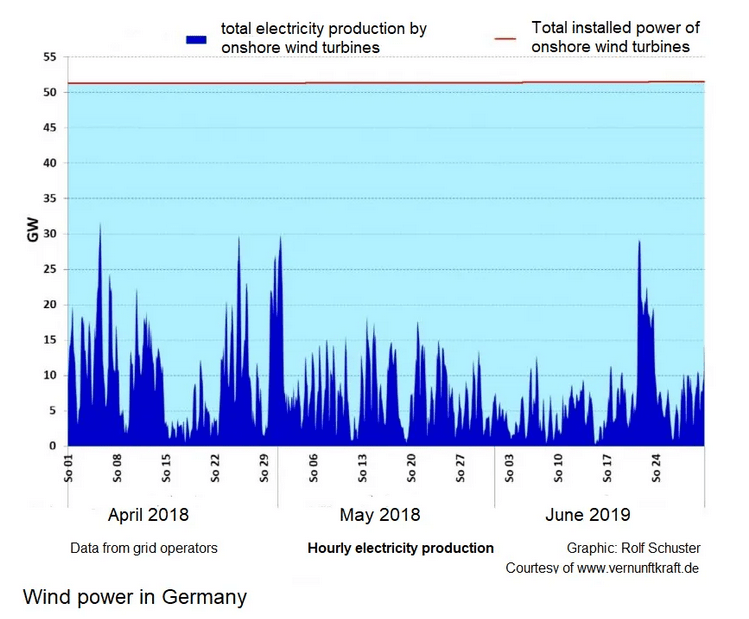 Unfortunately, most of the time the actual amount of electricity produced is only a fraction of the installed capacity. Worse, on “bad days” it can fall to nearly zero. In 2016 for example there were 52 nights with essentially no wind blowing in the country. No Sun, no wind. Even taking “better days” into account, the average electricity output of wind and solar energy installations in Germany amounts to only about 17% of the installed capacity.