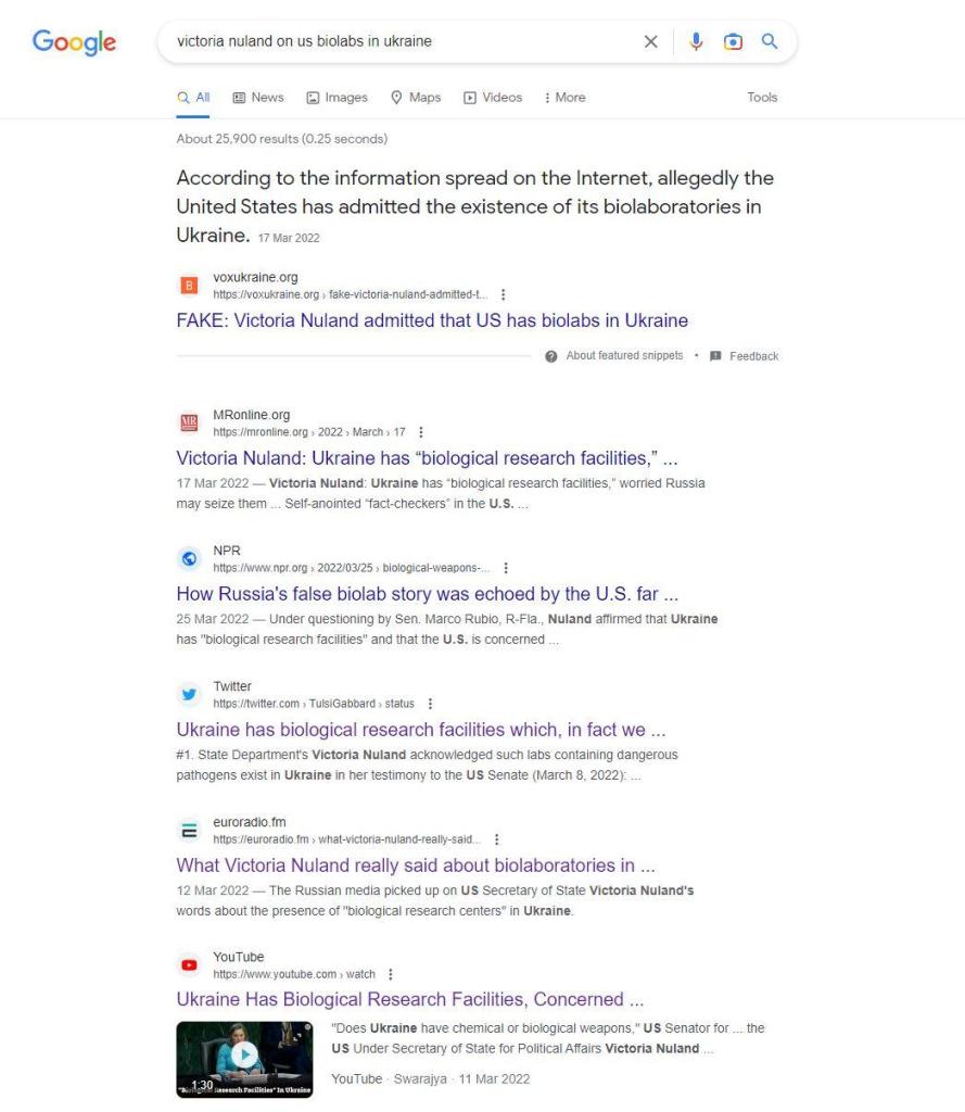 The fact is that the US has been involved in the operation of around twenty Biolabs in Ukraine. Even they don’t deny it. Those who follow international affairs and Western media informing about them must know that if something is declared “Russian propaganda” or “conspiracy” has a reasonable chance of being the truth. Another powerful indicator of a deliberate action to hide something from the general public is Google search results. Make your judgement based on this screenshot taken this morning AEST on 17th of April 2023.
